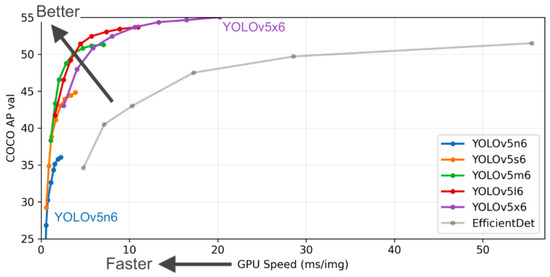 YOLOv5 [54] was released in 2020, very shortly after YOLOv4. This implementation shares the same design and provides higher performance than YOLOv4. YOLOv5 is fully written in the PyTorch framework, different from the past versions of YOLO that use the Darknet framework. YOLOv5 is significantly smaller, faster to train, and more accessible to use in a wider range of development environments (Ultralytics YOLOv5 GitHub repository (last seen 12 December 2022): https://github.com/ultralytics/yolov5). A performance comparison between EfficientDet and YOLOv5 can be seen in Figure 2.