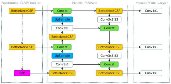 The structure diagram of the YOLOv5 network [56]. It consists of three parts: the Backbone that is the CSPDarknet53, the neck that is PANet and the Head that is the YOLO Layer.
