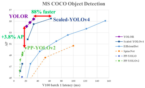 Wang et al. YOLOR paper describes an approach to combine explicit knowledge, defined as learning based on given data and input, with implicit knowledge learned subconsciously. “YOLOR unified network can generate a unified representation to simultaneously serve various tasks” [48]. YOLOR architecture applies prediction refinement, kernel space alignment, and multitask learning in a CNN and according to the results achieved, when implicit knowledge is introduced to the neural network that was already trained with explicit knowledge, the network benefits the performance of various tasks [48]. YOLOR achieved comparable object detection accuracy as the YOLOv4, while the inference speed was increased by 88% [48]. This made YOLOR one of the fastest object detection architectures in modern computer vision. A performance evaluation between YOLOv4, YOLOR, EfficientDet, and others, tested in the MS COCO dataset [8], is presented in Figure 5 (Information taken from Wong Kin-Yiu GitHub repository (last seen 12 December 2022): https://github.com/WongKinYiu/yolor). Tests made in the MS COCO dataset show that the mean average precision of YOLOR is 3.8% higher compared to the PP-YOLOv2, at the same inference speed [48]. Wang et al. adopted the MS COCO dataset because it provides rich annotation content with the Ground Truth (GT) for many different tasks including object detection, instance segmentation, and multi-image classification.