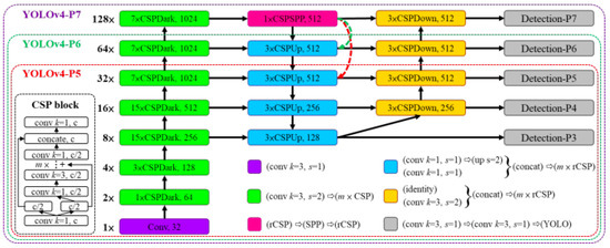 Wang et al. mention in their paper that YOLOR architecture is based on the architecture of YOLOv4 [48]. “YOLOR-P6 has same architecture as YOLOv4-P6-light, we replace all Mish activation in YOLOv4-P6-light by SiLU activation” [48]. “YOLOR-W6 is wider YOLOR-P6, base channels are set as {128, 256, 512, 768, 1024}” [48]. “YOLOR-E6 expands the width of YOLOR-W6, the width scaling factor is set as 1.25, and all of the convolution down-sampling modules are replaced by CSP convolution” [48]. The YOLOv4-P5, YOLOv4-P6 (same architecture as YOLOR-P6) and YOLOv4-P7 architecture diagrams can be seen in Figure 6.