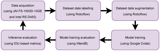 The training dataset is composed of three hundred images. Two-hundred ten for training, 45 for validation, and 45 for testing. These training images were labeled with five classes (using RoboFlow label tool (RoboFlow website (last seen 22 February 2022): https://roboflow.com/)): “Live Vegetation”, “Grass”, “Cut Vegetation”, “Tree Trunk” and “Dead Vegetation”. The class “Live Vegetation” can be defined as green vegetation in an upright position, the class “Grass” can be defined as small live and green vegetation low on the ground, the class “Cut Vegetation” can be defined as cut down vegetation and also minor tree branches on the ground. The class “Tree Trunk” can be defined as tree trunks in an upright position. Lastly, the class “Dead Vegetation” can be defined as dead/dry vegetation that was not cut down and is in an upright position. The dataset was acquired in a forest, near the Department of Electrical and Computer Engineering of the University of Coimbra. The vegetation in and around Coimbra includes a mix of Mediterranean and Atlantic flora. The dataset images were acquired with a JAI FS-1600D-10GE (JAI cameras website (last seen 21 July 2023): https://www.jai.com/products/fs-1600d-10ge) and with an Intel RealSense D455 (Intel Realsense cameras website (last seen 21 July 2023): https://www.intelrealsense.com/depth-camera-d455/).