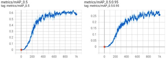 Figure 8, Figure 9, Figure 10 and Figure 11 present the mean Average Precision (mAP) at 0.5 and from 0.5 to 0.95 Intersection Over Union (IOU), precision, recall, box loss, classification loss, and objectness loss that resulted from the YOLOv5 training for a thousand epochs. These metrics are obtained over the training and validation sets from the training dataset.