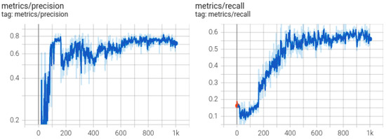 YOLOv5 model training performance metrics precision (left) and recall (right) during the 1000 epochs.
