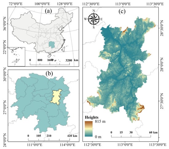 Study area: (a) the green area is Hunan, China; (b) the yellow area is the Chang-Zhu-Tan urban agglomeration; (c) DEM data (ASTER GDEM V3 data) of Chang-Zhu-Tan urban agglomeration.