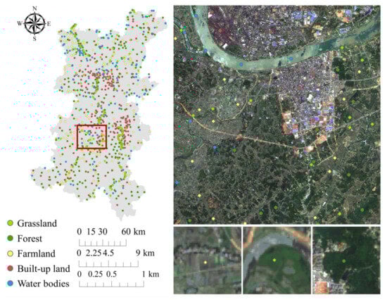 The Chang-Zhu-Tan urban agglomeration (Figure 1), which is located in the middle-eastern part of Hunan Province (28°04′ N, 112°59′ E), includes Changsha City, Zhuzhou City, and Xiangtan City. The study area comprises a humid subtropical monsoon climate with abundant rainfall and rich vegetation types. Over the past four decades, urbanization in Chang-Zhu-Tan has accelerated, making the land types in the urban agglomeration relatively scattered. Based on the Classification of Current Land Use (GB/T 21010-2017), and taking the specific status of vegetation in Chang-Zhu-Tan into account, the main vegetation types to be extracted include grassland, farmland, and forest. Other land types to be extracted include water bodies and built-up land.