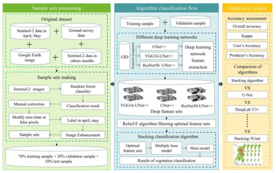 Approaches to the early vegetation classification were mostly based on mathematical statistical principles, such as maximum likelihood in supervised classification, minimum distance classification, and iterative self-organizing data analysis in unsupervised classification. Nevertheless, they required random uniform and normal samples; thus, various machine learning (ML) algorithms, such as support vector machines (SVM), decision trees, and random forests (RF), have been proposed and employed in vegetation classification studies [,,]. Normally, single ML algorithms have some inherent limitations, with potential instability across data and scenarios []. To solve this problem, a combination of multiple weak classifiers using the idea of ensemble learning (bagging, boosting, and Stacking) was able to obtain a better supervised result. Bagging and boosting used the simple idea of voting and averaging, while Stacking used the idea of weighting when combining the results of different classifiers, facilitating the extraction of vegetation information in highly heterogeneous areas [,].