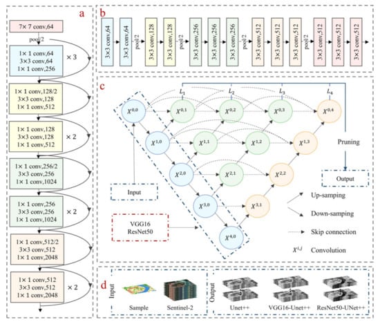 Structures of UNet++, VGG16-UNet++, and ResNet50-UNet++ networks: (a) structure of ResNet50; (b) structure of VGG16; (c) structure of UNet++; (d) input and output.