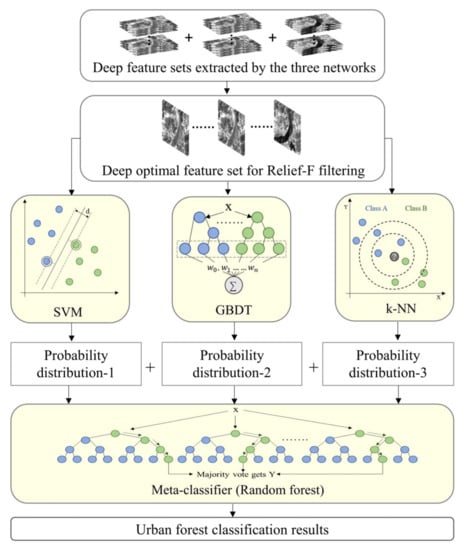 Section 3 of this paper focuses on describing methods for the classification of urban vegetation (Figure 3). In this study, we first pre-trained the UNet++, VGG16-UNet++, and ResNet50-UNet++ by transfer learning before extracting the features in the case of insufficient samples. Subsequently, the Relief-F algorithm was used to rank the importance of the extracted deep features, and the optimal feature sets were formed by filtering the top-ranked features to prevent data redundancy. Finally, the optimal feature sets were put into the ensemble learning training program to obtain the final urban vegetation classification results.
