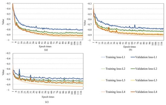 Loss curves of different FCNs: (a) loss curve of UNet++; (b) loss curve of VGG16-UNet++; (c) loss curve of ResNet50-UNet++.