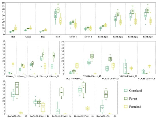 In this study, five deep features were selected in the L4 output set of each of the three FCNs, and the differences between different vegetation land types (grassland, forest, and farmland) were analyzed in FCNs via their deep features and the spectral features (Figure 7). The spectral features were reduced by a factor of 100 due to the large difference in the range of the different features. The near-infrared (NIR) and red edge bands of the spectral features were better at separating the three vegetation land types compared to the red, green, and blue bands and the short-wave infrared. However, the NIR and red edge bands were less distinguishable with respect to grassland and forest, while grassland and forest were significantly different in the deep features of UNet++_22, ResNet50-UNet++_16, ResNet50-UNet++_31, and VGG16-UNet++_5, which indicated that the deep features of the three FCNs could better distinguish grassland and forest. In addition, the deep level features in the three FCNs also differed significantly with respect to grassland and forest in terms of information about farmland.
