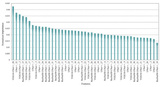 Deep features were extracted in this paper by using UNet++ (32), VGG16-UNet++ (32), and ResNet50-UNet++ (32). The deep features (96) extracted by all three networks were filtered based on the Relief-F algorithm, and the feature importance ranking was derived (Figure 8).