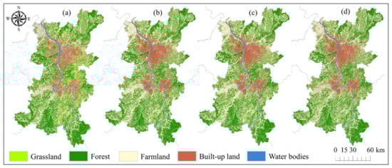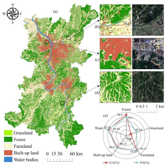 The urban vegetation classification results by UNS are shown in Figure 9a. A comparison of the classification results via visual discrimination showed that the distribution of the vegetation types (grassland, forest, and farmland) extracted via UNS corresponded to the actual surface conditions. Grassland was scattered throughout the study area, large areas of farmland were mainly located in the north-western part and near the rivers, and forest was evenly distributed in areas other than the cities.