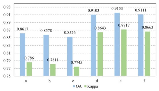 To verify the effectiveness of transfer learning, urban vegetation was classified by UNet++, VGG16-UNet++, and ResNet50-UNet++ without transfer learning (a, b, and c) and with transfer learning (d, e, and f), and accuracy evaluation results (Figure 10) were obtained. The results showed that the transfer learning followed by retraining UNet++, VGG16-UNet++, and ResNet50-UNet++ networks improved OA and Kappa by 4.86% and 0.0843, 5.75%, and 0.0906, and 5.85% and 0.0918, respectively, compared to the networks without transfer training. Of these, ResNet50-UNet++ with transfer learning resulted in the greatest improvement in OA and Kappa. The transfer learning was shown to reduce the generalization error and improve the training efficiency of the network in the case of insufficient samples, which is consistent with previous research findings [].