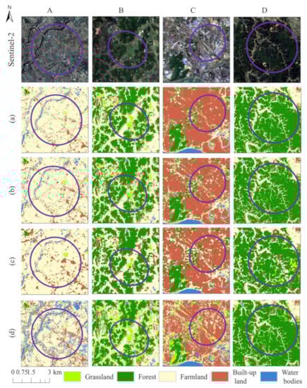 Four subareas were selected from the study area—farmland, suburban, urban, and mountainous areas—to qualitatively analyze the classification results of UNS. First, the ungrown farmland was easily misclassified into built-up land and water bodies due to the close proximity of the ungrown farmland and built-up bare land features. Compared to the other methods that used convolution to extract features, RF clearly misclassified the farmland in region (a) into built-up land and water bodies. In the three methods that used convolution (UNS, U-Net, and DeepLab V3+), UNS reduced the built-up land misclassification into farmland compared to the other networks (Figure 13C). Furthermore, UNS and RF distinguished grassland more accurately than U-Net and DeepLab V3+ in region (b). UNS reduced the loss of forest boundaries compared to the results derived by RF. Forest was misclassified as grassland in the RF and DeepLab V3+ results (Figure 13C,D) due to the effect of mountain shading. In contrast to U-Net, UNS showed less “salt-and-pepper” (Figure 13D). Therefore, combining deep learning and ensemble learning, UNS was able to enhance the generalization and robustness of the model by combining deep features extracted by different networks and effectively extracting information on urban vegetation over large areas [].