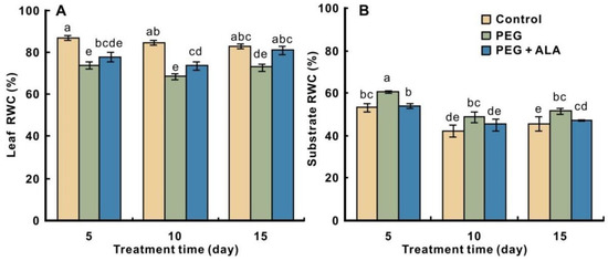 Compared with the control, leaf RWC of PEG-stressed walnut was significantly decreased (p < 0.05) during the three time points (Figure 1A), suggesting that PEG stress impairs the water balance of walnut leaves. Nevertheless, PEG + ALA pretreatment significantly alleviated the decrease in leaf RWC. The tendency of RWC indicates that ALA treatment improves the leaf water status of walnuts under PEG stress. On the other hand, PEG treatment significantly increased the RWC of the culture substrate (Figure 1B), implying that PEG stress blocks walnuts absorbing water from the high osmotic substrate and, therefore, more water remained in the substrate. The substrate RWCs of the PEG + ALA and control were almost the same; both were generally lower than that of the PEG treatment. These results suggest that ALA pretreatment enables plants to absorb water from the high osmotic substrate to maintain water homeostasis.