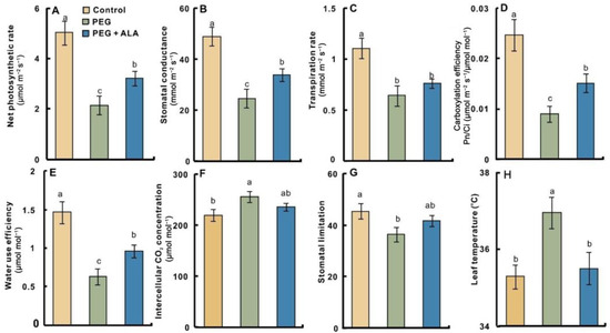 The leaf photosynthetic gas exchanges of walnuts were measured on the tenth day after treatments. PEG stress significantly inhibited the photosynthesis of walnut leaves, while ALA pretreatment alleviated the inhibition (Figure 2). The net photosynthetic rate (Pn), stomatal conductance (Gs), transpiration rate (Tr), carboxylation efficiency (Pn/Ci) and water use efficiency (WUE) in the PEG-treated leaves were 42.80%, 50.11%, 58.23%, 36.67% and 42.79% less than those of the control, respectively, and all the differences were statistically significant (p < 0.05). When ALA was applied on walnuts, these indicators were 49.88%, 37.17%, 18.02%, 66.47% and 53.28% higher than those of PEG treatment. Among them, all differences, but in Tr, were significant at p = 0.05. Conversely, PEG stress significantly increased the intercellular CO2 concentration (Ci), while ALA pretreatment depressed the increase (Figure 2F). The stomatal limitation (Ls) in the PEG stress was significantly decreased compared with that of the control, while ALA treatment increased it (Figure 2G). The Ci increase and Ls decrease induced by PEG stress was due to a decrease in CO2 fixation instead of more CO2 intake into stomata. Therefore, the decrease in Ci and the increase in Ls induced by ALA compared with PEG alone may be the results of promotion of CO2 fixation in the leaves. It was interesting to notice that PEG stress induced the foliar temperature increased by 1.6 °C, which was significantly higher than that of the control (Figure 2H), and this was inhibited by ALA application. This result is consistent with the higher Gs of ALA treatment, which can decrease the foliar temperature by maintaining transpiration and leaf heat dissipation to some extent.