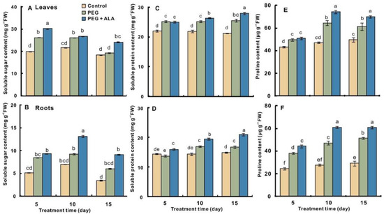 Moreover, the accumulation of free proline in walnut tissues was beneficial to reduce drought damage, which was increased by 30%, 6% and 21% in leaves and 33%, 23% and 86% in roots, respectively, as compared the control with PEG stress. The application of ALA facilitated proline accumulation, which brought out the additional rise of 16% and 54% in leaves for the tenth and the fifteenth day and 46%, 94% and 89% for three time points in roots, respectively (p < 0.05). The findings manifest that ALA may promote the soluble sugars, soluble proteins and free proline in the walnuts’ leaves and roots, to withstand osmotic stress.