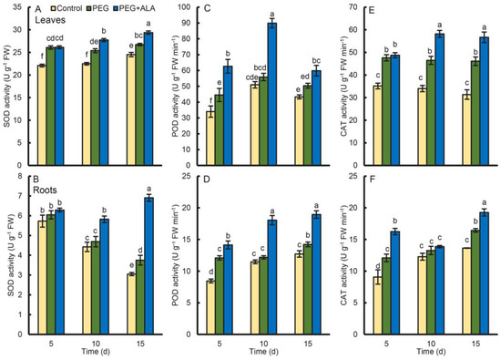 The activities of antioxidant enzymes, including SOD, POD and CAT were investigated to establish the roles of ALA in response to osmotic stress in walnuts, wherein their activities were consistently higher in the leaves than those in the roots (Figure 6). With respect to SOD, PEG stress significantly stimulated its activity in the leaves during the three time points; however, the enzyme activity in the roots of the PEG treatment group was significantly higher than that of the control only at the fifteenth day. It seems that the walnut cannot increase the SOD activity in the roots as greatly as that in the leaves when the plants are stressed by PEG. Nevertheless, ALA pretreatment significantly improved SOD activity both in the leaves and roots, especially at the middle and late stages. At the fifteenth day, the SOD activity in the ALA-treated roots was 226% as high as that of the control, which was also 184% as high as that of the PEG treatment.
