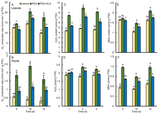 The PEG-induced osmotic stress brought walnuts drought injuries, and, as a result, their leaves and roots produced more ROS than the control (Figure 7). The superoxide anion (O2•−) production rates were dramatically increased by 15%, 40% and 76% in the leaves, and by 272%, 508% and 415% in the roots, for three time points, respectively (p < 0.05), indicating that the walnut roots produce much more O2•− than the leaves under osmotic stress. Conversely, ALA pretreatment significantly depressed the rise in the O2•− production rate induced by PEG stress at all time points. The grand means of the three time points of PEG + ALA were 79% and 52% of that of PEG in the leaves and roots, respectively (Figure 7A,B). Thus, ALA treatment greatly suppressed O2•− production under osmotic stress, especially in the roots of walnut plants.
