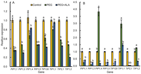 Figure 9A shows that the expression of PIP and TIP genes in walnut leaves were all downregulated, but only a few of them (PIP1;4 and TIP1;1) were upregulated by ALA pretreatment. The expressions of other genes were not responsive to ALA pretreatment or were even further downregulated. On other hand, the expressions of PIP1;4 and TIP1;1, as well as TIP1;2, in the roots were significantly upregulated by PEG stress; however, ALA pretreatment prevented the increases. The other genes, including PIP1;1, PIP1;3, PIP1;5 and TIP120 in the roots were downregulated by PEG, but prevented by ALA pretreatment. These suggest that different aquaporin genes had different expression models in different walnut tissues.