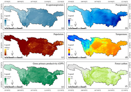 Multi-year average values of each dataset in the Yangtze River Basin during 2005–2020. Note: (a–f) are multi-year averages of evapotranspiration, precipitation, population, temperature, Gross primary productivity (GPP) and forest carbon stocks, respectively. Each figure is calculated using the data from 2005 to 2020.