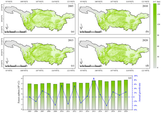 Summary and spatiotemporal pattern of forest carbon stock in Yangtze River Basin. Note: (a–d) show the spatial distribution of forest carbon stock in the Yangtze River Basin in 2005, 2010, 2015 and 2020, respectively. (e) is the change and annual growth rate of total forest carbon stock from 2005 to 2020. The lowest value of forest carbon storage in the Yangtze River Basin was 4.8 × 109 t C in 2006, and the highest value was 5.7 × 109 t C in 2020. The average annual growth rate was 0.91%. From 2005 to 2020, the spatial pattern of forest carbon stock was stable.