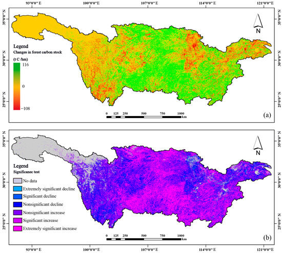 The variation trends and significance of forest carbon stock in Yangtze River Basin. Note: (a) Shows the trend analysis results of forest carbon stock changes in the Yangtze River Basin from 2005 to 2020. (b) The result of the significance test for trend analysis.