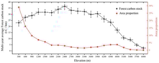 The forest carbon stock and area proportion varies with altitude.