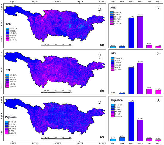 Multi-year correlation between forest carbon stock and environmental factors. Note: (a–c) show the spatial characteristic of correlation between forest carbon stock and environmental factors. (d–f) show the proportion of each correlation. E-S-P-CR: extremely significant positive correlation; S-P-CR: significant positive correlation; NS-P-CR: nonsignificant positive correlation; E-S-N-CR: extremely significant negative correlation; S-N-CR: significant negative correlation; NS-N-CR: nonsignificant negative correlation.