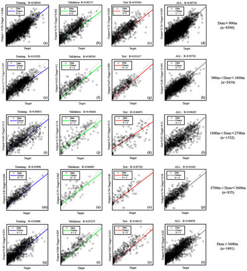 Result of contribution rate analysis based on BP neural network. Note: The figure shows the modeling results of the BP neural network at different elevations. (a–d) show the correlation coefficient of Training, Validation, Test and All of Dem ≤ 900 m (n = 8590). (e–h) show the correlation coefficient of Training, Validation, Test and All of 900 m < Dem ≤ 1800 m (n = 2434). (i–l) show the correlation coefficient of Training, Validation, Test and All of 1800 m < Dem ≤ 2700 m (n = 1332). (m–p) show the correlation coefficient of Training, Validation, Test and All of 2700 m < Dem ≤ 3600 m (n = 835). (q–t) show the correlation coefficient of Training, Validation, Test and All of Dem > 3600 m (n = 3491). Filter high-performing models based on the value of the correlation coefficient between the simulation and observation. The contribution rate of each factor is given in Table 3.