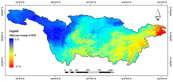 Multi-year average of SPEI during 2005–2020 in the Yangtze River Basin.