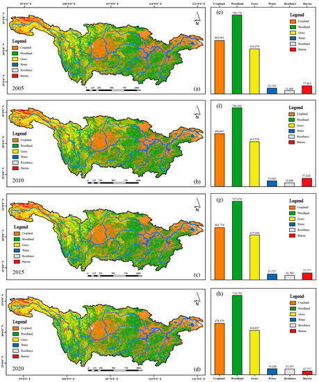 Spatiotemporal patterns of LUCC in the Yangtze River Basin. Note: (a–d) show the spatial characteristic of LUCC in 2005, 2010, 2015 and 2020, respectively. (e–h) show the proportion of each land cover including Cropland, Woodland, Grass, Water, Residence and Barren. Woodland refers to forestry land where trees, shrubs, bamboo, and mangroves grow. It is divided into Dense, Shrubland, and Sparse according to the degree of closure. Grass refers to all kinds of grassland that mainly grow herbaceous plants and covers more than 5%, which is divided into >50%, 20%–50%, and <20% according to the degree of closure. Water refers to natural terrestrial waters and land used for water conservancy facilities. It is divided into Canals, Seas, Reservoirs, Glaciers, and Beaches according to the state of matter. Residence refers to urban and rural settlements, as well as industrial, mining, and transportation land. It is divided into Urban, Rural, and Other construction sites. Barren refers to land that has hitherto been unused, including hard-to-use land. It is divided into Sand, Desert, Alkali, Swamp, Exposed, and Rock. Cropland refers to the land on which crops are grown. Depending on the irrigation method, Cropland is divided into Dryland and Paddy.