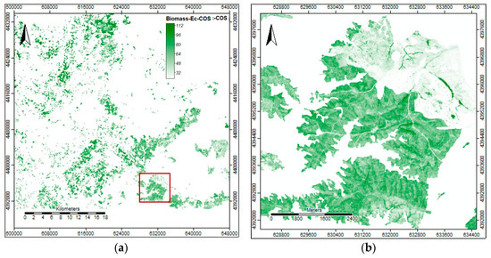 The COS2018 regarding eucalypts areas and shrubland areas and the corresponding AGB maps are presented in Figure 10. The AGB values extracted for eucalypts areas presented an average of 78.76 Mg ha−1, and for shrubland areas, an average of 15.55 Mg ha−1 (Table 9), which were thus consistent with the average estimated field values (Table 7).