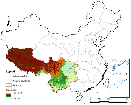 Southwestern China, according to its administrative and geographical divisions, includes provinces and municipalities such as Sichuan, Yunnan, Guizhou, Chongqing, and Tibet (Figure 1). It is situated between 78°42′ E and 110°11′ E (longitude) and 21°13′ N and 36°53′ N (latitude) [52]. The region has complex and diverse topography, including high mountains, hills, basins, plateaus, and gorges, among other landform types [52]. The main climate types in Southwestern China are subtropical monsoon climate and plateau climate. The summers are hot and humid, while the winters are relatively warm. The region receives abundant rainfall, making it one of the rainiest areas in China. However, due to the influence of topography, the distribution of rainfall is uneven. The eastern and southern parts of the region experience higher precipitation, while the western and northern parts receive relatively less rainfall [53]. Southwestern China possesses abundant human resources and a diverse ethnic culture. It is also rich in forestry resources, with a variety of forest types, including subtropical evergreen broadleaf forests, coniferous forests, and mixed conifer-broadleaf forests [54,55].