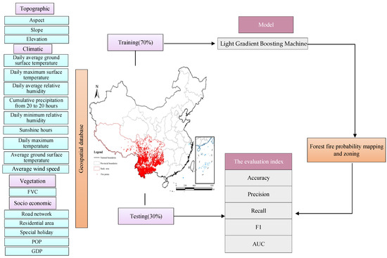 By analyzing vast amounts of data, these models can identify and understand the complex relationships between these factors. Utilizing large-scale data to perform training and learning enables machine learning models to make more comprehensive predictions and assessments of forest fire occurrence risks. Ensemble learning can reduce a model’s sensitivity to outliers and noisy data, thereby improving the model’s generalization ability. A boosting algorithm is a branch of ensemble learning, through which a series of weak classifiers are sequentially trained, and the weights of subsequent classifiers are adjusted based on the results of the previous classifier, gradually improving the overall performance of the classifier [43,44,45]. Examples of boosting algorithms include Gradient Boosting and XGBoost (Extreme Gradient Boosting) [46,47]. Indeed, the LightGBM algorithm excels in terms of performance, efficiency, and running speed relative to GBDT (Gradient Boosting Decision Trees), XGBoost, and other traditional machine learning methods [48,49]. It is true that the application of the LightGBM model in the field of forest fire prediction is relatively limited, especially in the prediction of forest fire occurrences in Southwestern China, where no reports have been published. Southwestern China, including Yunnan Province, Sichuan Province, Chongqing Municipality, etc., is a frequent occurrence area for forest fires [50].