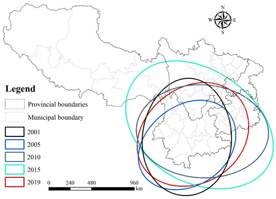 The standard deviation ellipse method is a technique used to describe the spatial distribution characteristics of a study object. Through this method, we could visually understand various features of the study object, such as centrality, distribution range, direction, and shape [60,61];