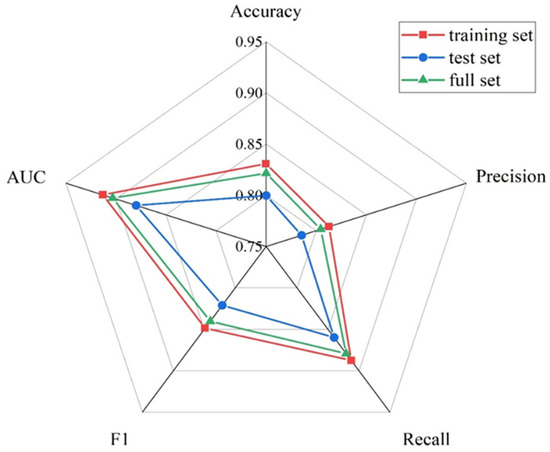 The specific performance metrics of the model, including accuracy, precision, recall, F1 score, and AUC, are shown in Figure 6. For the training dataset, the accuracy is 83.089%, precision is 81.27%, recall is 88.76%, F1 score is 84.85%, and AUC is 91.32%. For the testing dataset, the accuracy is 79.99%, precision is 78.54%, recall is 85.98%, F1 score is 82.09%, and AUC is 87.98%. The performance metrics used for the entire dataset are as follows: the accuracy is 82.16%, precision is 80.45%, recall is 87.93%, F1 score is 84.02%, and AUC is 90.32%.