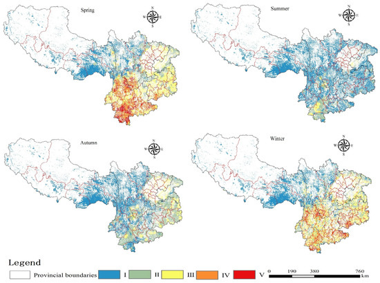 In this study, the prediction and spatial zoning were performed using the LightGBM model, as illustrated in Figure 7; the forest fire occurrences for each season are as follows: Across the year, elevated forest fire risks are concentrated in specific regions: Yunnan Province (comprising Pu’er City, Xishuangbanna Dai Autonomous Prefecture, and Wenshan Zhuang and Miao Autonomous Prefecture), Sichuan Province (encompassing Liangshan Yi Autonomous Prefecture and Panzhihua City), Guizhou Province (including Qiannan Buyei and Miao Autonomous Prefecture), and select areas of Chongqing Municipality. The most frequent forest fire occurrences align with spring and winter, followed by autumn and summer. During spring, Yunnan Province (including Honghe Hani and Yi Autonomous Prefecture, Lijiang City, and Chuxiong Yi Autonomous Prefecture), Sichuan Province (encompassing Liangshan Yi Autonomous Prefecture, Suining City, and Panzhihua City), Guizhou Province (covering Tongren City, Qiannan Buyei, and Miao Autonomous Prefecture), and specific areas of Chongqing Municipality experience heightened forest fire risk. The areas at highest risk in summer include Pu’er City in Yunnan Province, Panzhihua City in Sichuan Province, and certain areas of Chongqing Municipality. Autumn elevates the risk in Panzhihua City in Sichuan Province, Wenshan Zhuang and Miao Autonomous Prefecture of Yunnan Province, Yuxi City in Yunnan Province, and specific areas of Chongqing Municipality. Areas at the highest risk in winter include Yunnan Province (including Nujiang Lisu Autonomous Prefecture, Dali Bai Autonomous Prefecture, Lijiang City, and Wenshan Zhuang and Miao Autonomous Prefecture), Sichuan Province (covering Liangshan Yi Autonomous Prefecture and Panzhihua City), Guizhou Province (encompassing Qiannan Buyei and Miao Autonomous Prefecture, Tongren City), and specific areas of Chongqing Municipality. During winter, areas at the highest risk of forest fires include Yunnan Province (including Nujiang Lisu Autonomous Prefecture, Dali Bai Autonomous Prefecture, Lijiang City, and Wenshan Zhuang and Miao Autonomous Prefecture), Sichuan Province (encompassing Liangshan Yi Autonomous Prefecture and Panzhihua City), Guizhou Province (including Qiannan Buyei and Miao Autonomous Prefecture and Tongren City), and specific areas of Chongqing Municipality. The climate conditions of Southwestern China include high temperatures, dryness, and strong winds. These climatic conditions make vegetation more susceptible to drying out and catching fire, thus increasing the risk of forest fires [67].