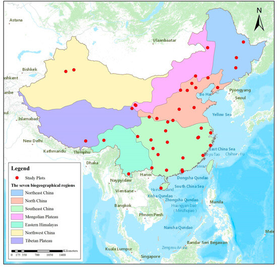 China is a vast country with diverse climates and vegetation types [34], leading to different forest color compositions among regions. To determine the influence of forest park establishment on color authenticity in each region, we divided China into seven biogeographic regions [35] (henceforth, regions) based on climate and vegetation distribution: northeast China, north China, northwest China, Mongolian Plateau, Tibetan Plateau, eastern Himalayas, and southeast China [36,37]. Using the inventory of national forest parks (henceforth, parks) in China (https://www.maigoo.com/goomai/167110.html (accessed on 17 February 2023)), we randomly selected one to two parks from each provincial administrative region for a total of 43 parks from diverse regions (Figure 1).