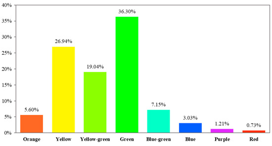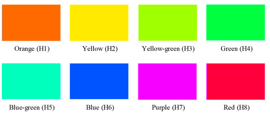 As the primary basis for distinguishing different colors [43], hue (H) is relatively less affected by external factors, such as light and viewing distance, than saturation and value [44]. Therefore, in this study, color classification was performed based on a range of hue values. We used a secondary K-means clustering approach for color classification [33] with the following steps: (1) determine the optimal k-value using the elbow method [45] to cluster the color information of each forest image, and (2) set the k-value to eight to cluster the H-value of the clustered colors of each image [46]. The secondary clustering results were then adjusted according to human eye color sensitivity [42,47]. Finally, we quantified the forest colors as orange [0, 25] or (345, 360], yellow (25, 55], yellow-green (55, 75], green (75, 140], blue-green (140, 165], blue (165, 220], purple (220, 290], and red (290, 345] (Figure 2), and performed the color index calculation: