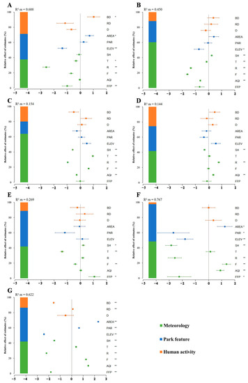 The fixed effect R2m showed (Figure 4) that environmental factors explained the H1, H2, H7, and H8 (0.688, 0.450, 0.767, and 0.622, respectively) better than the H3, H5, and H6 (0.154. 0.144, and 0.269, respectively), indicating that orange, yellow, purple, and red were more sensitive to environmental factors. From each variable group, the relative effect estimates of anthropogenic disturbances from forest parkification for H1 (62.44%), H5 (58.31%), H6 (58.09%), H7 (51.56%), and H8 (58.02%) were greater than those of meteorological factors (37.56%, 41.69%, 41.91%, 48.44%, and 41.98%, respectively), indicating that orange, blue-green, blue, purple, and red were more sensitive to anthropogenic disturbances than meteorological factors. The relative effect estimates of meteorological factors for H2 (60.30%) and H3 (63.97%) were greater than those for anthropogenic disturbances (39.70% and 36.03%, respectively), indicating that yellow and yellow-green were more sensitive to meteorological factors than to anthropogenic disturbances. Among the anthropogenic disturbance factors, the relative effect estimates of park features for H1 (33.63%), H2 (27.85%), H5 (32.71%), H6 (46.76%), H7 (49.21%), and H8 (44.39%) were greater than those of human activities (28.81%, 11.86%, 25.61%, 11.34%, 2.34%, and 13.63%, respectively), indicating that orange, yellow, blue-green, blue, purple, and red were more sensitive to park features than human activity factors. The relative effect estimates of human activity for H3 (19.90%) were greater than those for park features (16.13%), indicating that yellow-green was more sensitive to human activity than to park features.