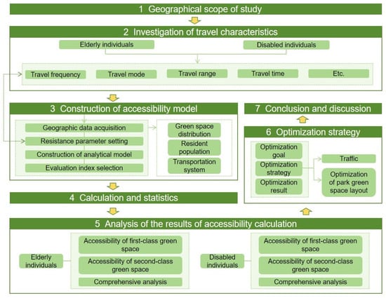 According to related research, it has been established that the elderly often seek refuge in park green spaces as an ideal setting for physical and mental recovery and rehabilitation []. Unfortunately, due to various negative factors such as societal concepts, levels of facility services, and self-awareness, individuals with disabilities rarely frequent these health-promoting park green spaces. Numerous scholars have conducted comprehensive studies on aspects like spatial layout, materials and facilities, aging design, and barrier-free and inclusive design of park green spaces. However, for the elderly and disabled individuals, convenient, prompt, and safe access to these parks is a prerequisite to fully enjoying the ecological services they offer. Thus, the accessibility of park green spaces holds even greater significance for these individuals compared to others.