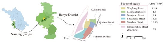 The study focused on Jianye District, one of the main districts in the city of Nanjing, situated in the southwestern part of the city (Figure 2). Jianye District encompasses six streets, namely Mochou Lake, Xinglong, Nanyuan, Shazhou, Shuangxia, and Jiangxinzhou, comprising a total of 60 communities and six community preparatory groups. As of the end of 2019, the resident population in the study area was 505,600. The research area is surrounded by natural rivers on the east, west, and south sides, with a clearly defined large green space on the northern side, which distinguishes the research area from other regions of the city. Jiangxinzhou street was excluded from the study area due to incomplete development and an incomplete road network.