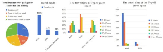 The majority of the elderly population exhibited a strong demand for green spaces (Figure 3). When traveling to Type I green spaces, walking was the primary mode of transportation, supplemented by cycling and public transportation. Type II green spaces were mostly accessible by walking, with a maximum travel time of generally less than 15 min.