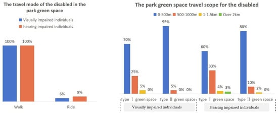 Most disabled individuals have a demand for park green space travel, but their frequency of travel is not high. Their preferred mode of transportation is primarily walking, with fewer choosing other modes of travel for activities in green spaces. Due to the difficulty in determining the travel speed of disabled individuals and the increased likelihood of encountering obstacles with larger travel distances, the questionnaire for disabled individuals focused on measuring travel distance rather than travel time, which better aligns with their travel habits.
