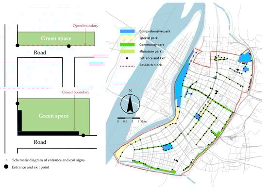 Using remote sensing satellite image maps, network maps, and handheld GPS devices, all entrances and exits of park green spaces were identified and labeled. For green spaces with closed boundaries, where visitors can only enter and exit through specific entrances and exits, the intersections of the entrances and roads were designated as entrance and exit points and marked accordingly. In green areas with open boundaries, visitors have the flexibility to enter from any point along the green area boundary. In this case, the points where the green area intersects with other roads are identified as entrance and exit points, and a total of 208 such points are marked (Figure 5).