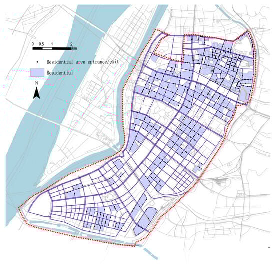 The outer boundaries of all residential areas within the study area were delineated in ArcGIS based on internet maps and satellite image maps, resulting in the creation of a residential area dataset. Through GPS device positioning and searching maps on the internet, a total of 636 entrances and exits were identified for the 246 residential areas in Jianye District. These coordinate points were imported into GIS, underwent coordinate transformation, and were exported as element classes (Figure 6). This dataset serves as one of the core data sources for subsequent accessibility calculations.