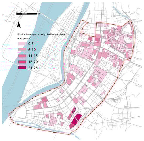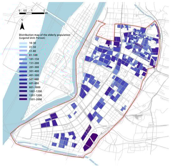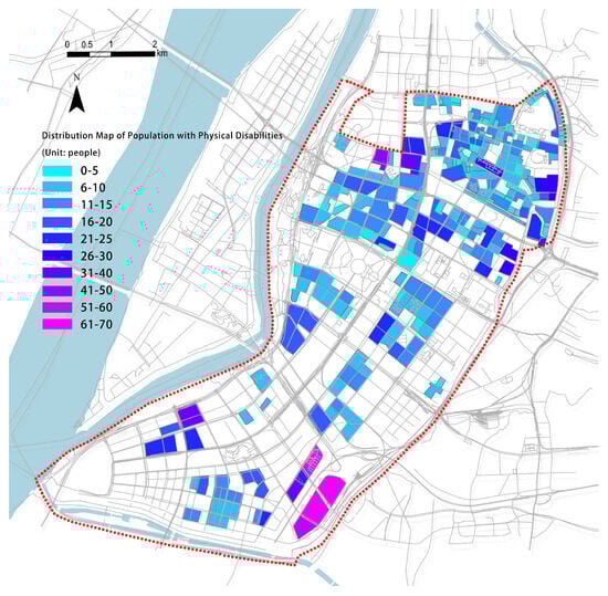 To analyze the distribution of the elderly population, the number of elderly individuals was associated with the residential area dataset, resulting in a map depicting the spatial distribution of the elderly population (Figure 7). Similarly, the number of disabled individuals was associated with the residential area dataset, generating distribution maps of the disabled population (Figure 8 and Figure 9).