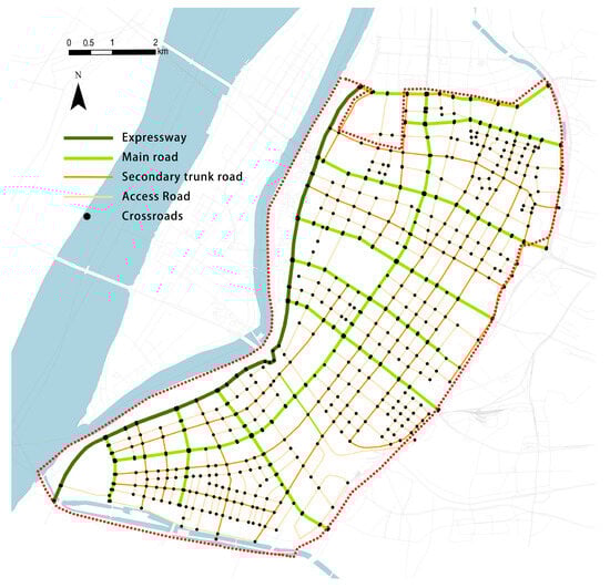 Utilizing OpenStreetMap as a data reference, irrelevant data such as roads within residential areas, internal roads within green spaces, and disconnected roads were removed. Additionally, certain sections of the road network were corrected based on satellite image maps. The road network of Jianye District was then analyzed, and the expressways, main roads, secondary roads, branch roads, and intersections were extracted (Figure 10).