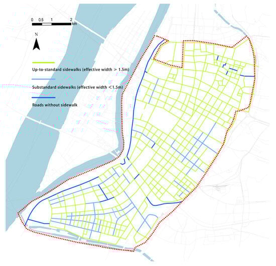 A comprehensive study was conducted on all roads within the study area, encompassing a total of 141 roads with a combined length of 244.7 km. Among these roads, 227.5 km (93%) were constructed with sidewalks. Sidewalks with an effective passing width exceeding 1.5 m accounted for 177.5 km (78%), achieving a compliance rate of 78%. Sidewalks meeting the standard constituted 72.5% of the total length of all roads (Figure 11).